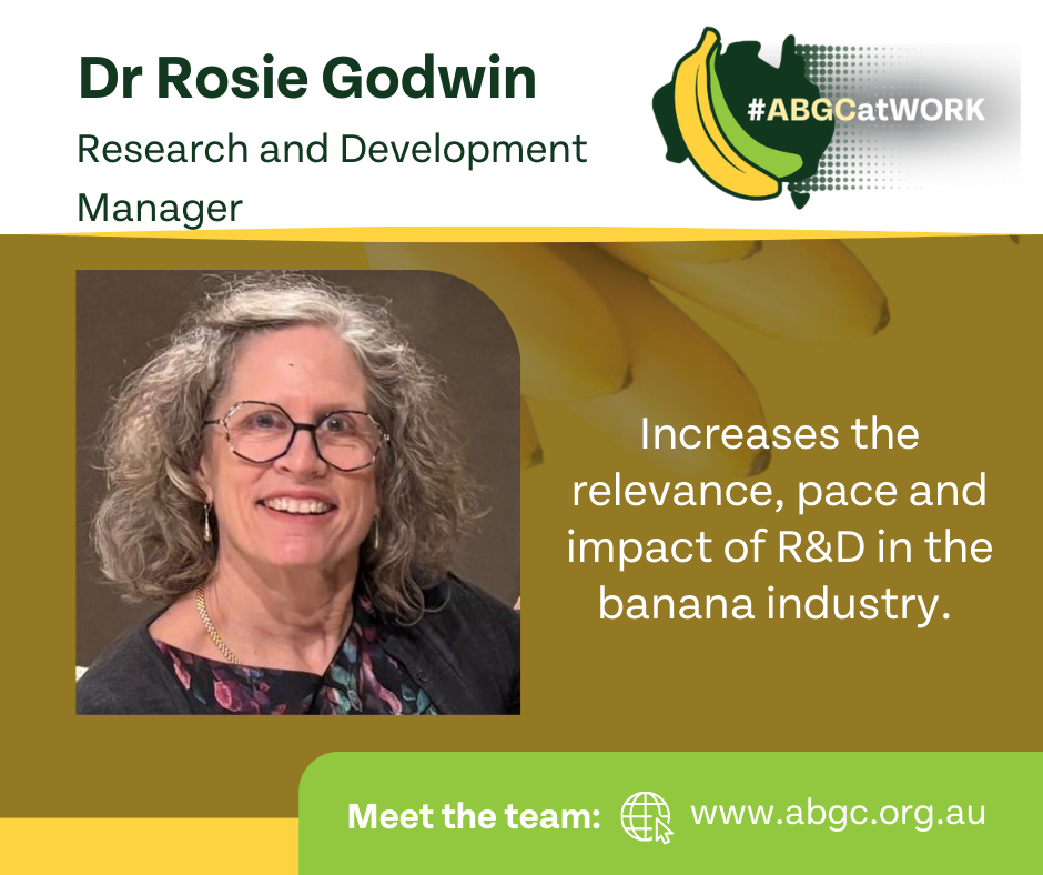 #ABGCatWork – Dr Rosie Godwin 12 January 2024 PURPOSE OF YOUR ROLE:To increase the relevance, pace and impact of R&D in the banana industry.HOW has YOUR ROLE HAD IMPACT FOR GROWERS?A well coordinated R&D program is in place which is targeted to the industry’s needs.New project opportunities have been secured e.g. in automation, food waste reduction, the national tree crop map and benchmarking.Delivered the Scientific Symposium at the 2023 Banana Industry CongressYOUR BACKGROUND: Rosie was a research scientist for more than 25 years before she joined ABGC in 2015.Get in touch:[email protected]FUNDED BY:Hort Innovation Rosie is part of the ABGC's Leadership Team ABGC LEADERSHIP TEAM