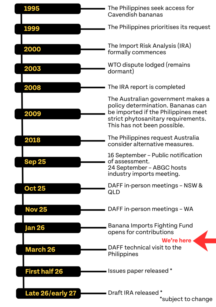 The Department of Agriculture, Fisheries and Forestry’s technical visit to the Philippines has now been confirmed for late March 2026. This is still subject to change pending any unforeseen circumstances. The technical visit was initially scheduled for late 2025, but had to be delayed due to extreme weather. It is one of several avenues that inform the imports risk assessment.
