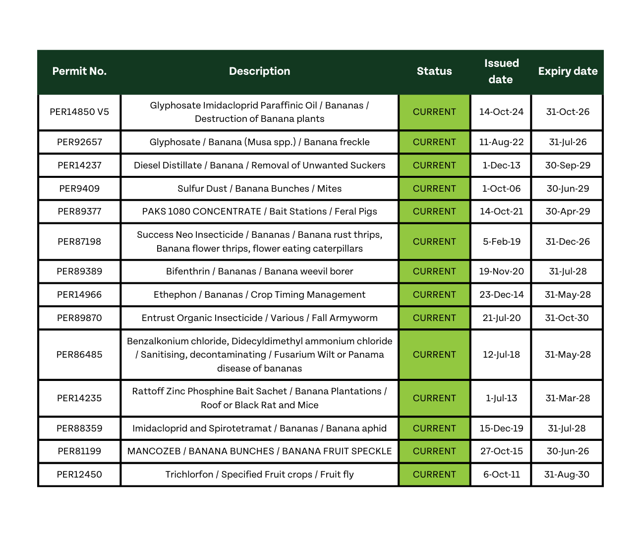 Current chemical permits for the banana industry Current chemical permits for the banana industry Please note, while every effort is made to ensure this list is up to date, please refer to the APVMA for the most recent information. Last updated 9 December 2025 All uses of chlorpyrifos now cancelled - read more here